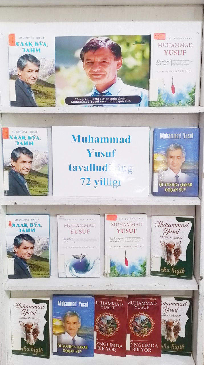 Shu munosabat bilan joriy yilning 22-aprel kuni Sirdaryo tuman axborot-kutubxona markazi o’quv zalida O’zbekiston xalq shoiri Muhammad Yusuf tavalludining 72 yilligiga bag’ishlab «Betakror shoir» mavzusida ko’rgazma tashkil etildi. Ushbu ko’rgazmada shoirning bir qancha kitoblari va rasmli faktlar o’rin olgan.